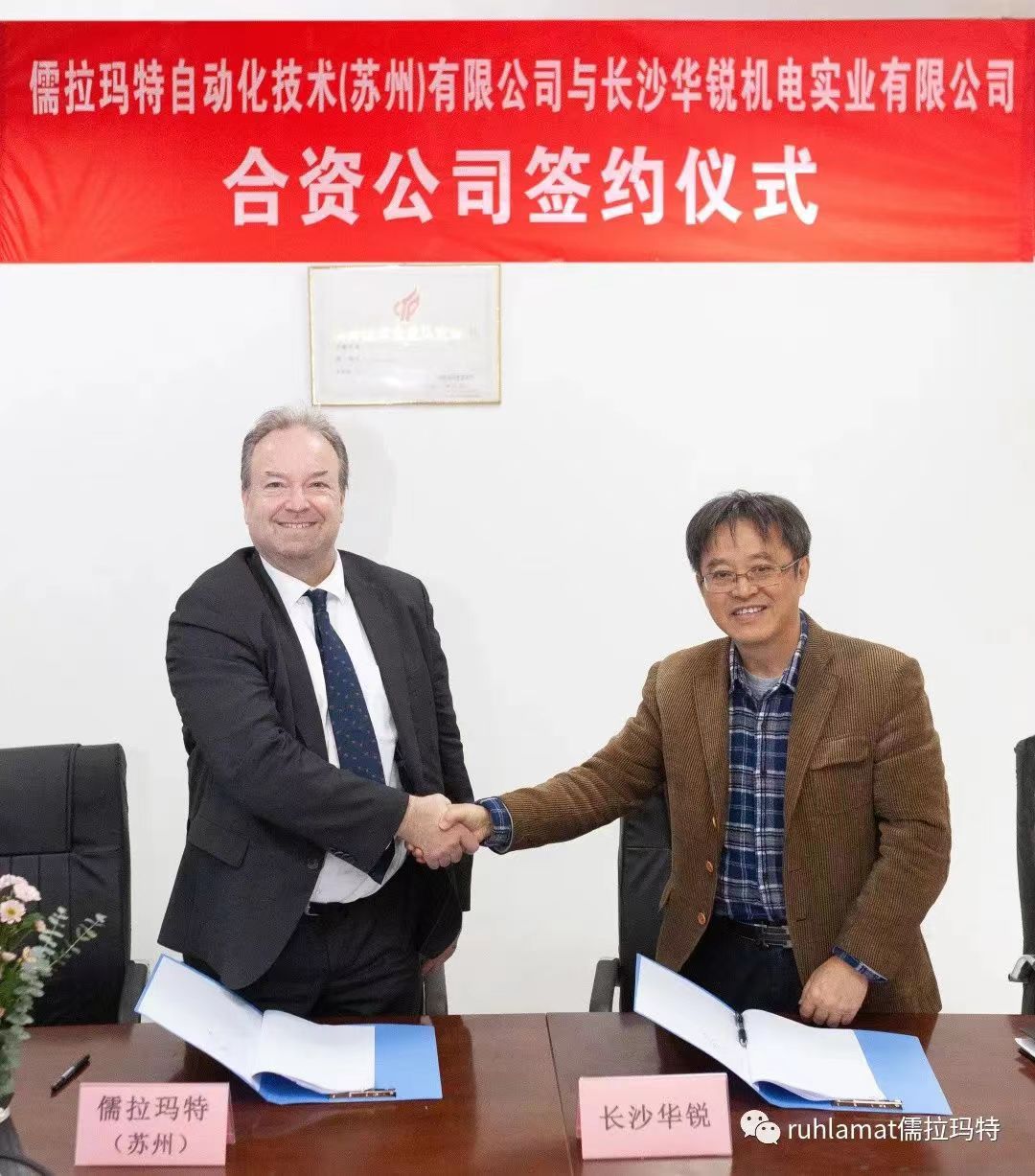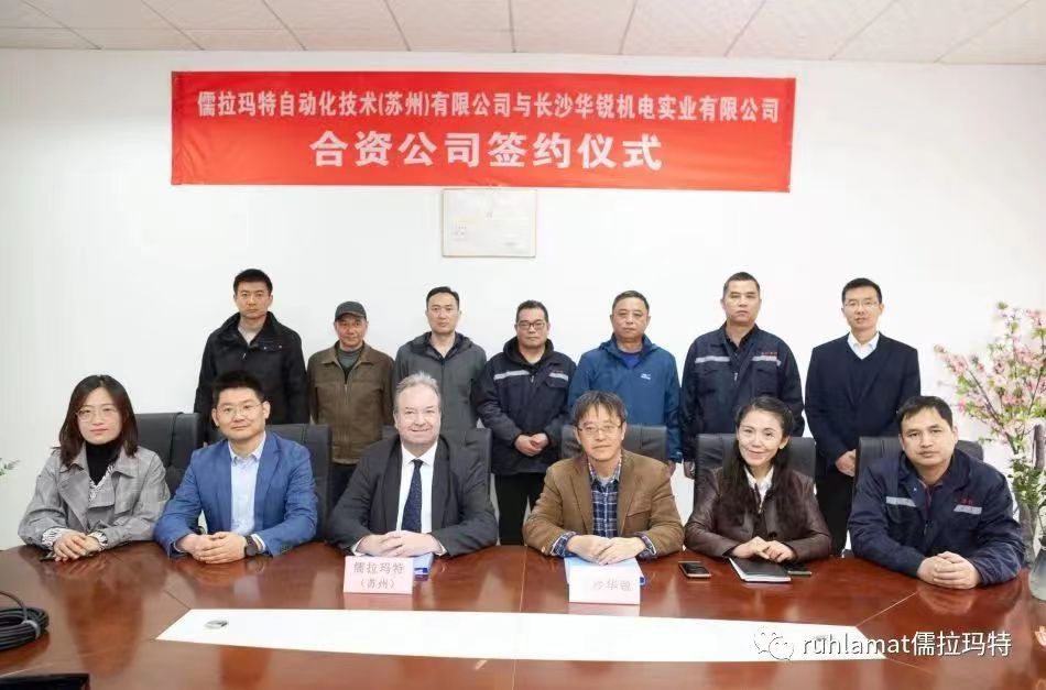 儒拉瑪特自動化技術(蘇州)有限公司與長沙華銳機電實業有限公司在長沙舉辦了合資公司簽約儀式,儒拉瑪特(蘇州)董事總經理白世泰先生與長沙華銳總經理王小明先生簽署合作協議。