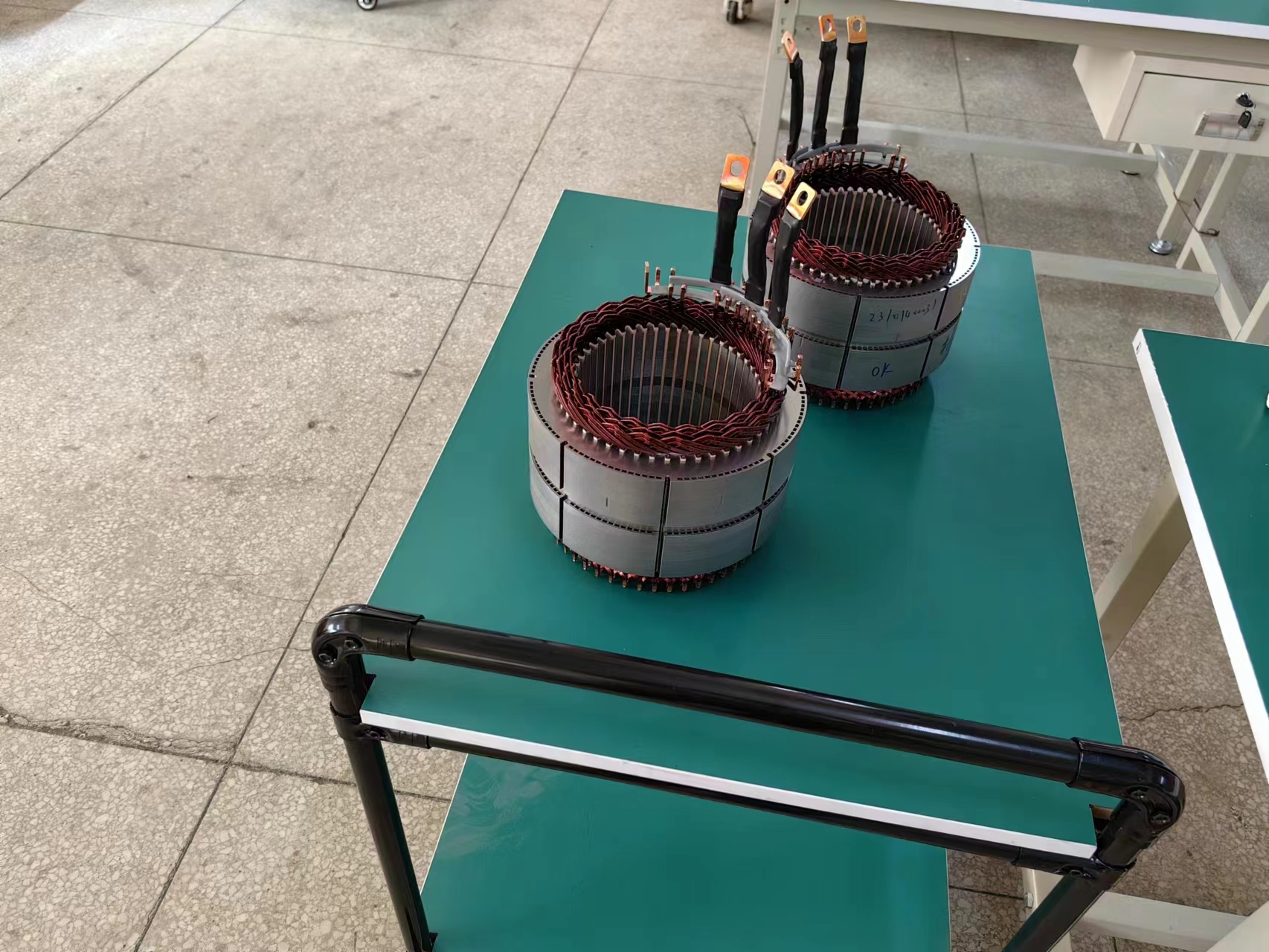 (1)鐵芯上絕緣紙(B形、S形、O型)→(2)漆包扁線下線去漆成U型→(3)異形線定長下線去漆→(4)異形線成型→(5)星點線焊接→(6)人工預插線入定子鐵芯→(7)線圈整形壓入鐵芯→(8)非出線端自動伺服扭頭并自動消除回彈角→(9)非出線端線頭自動切平→(10)非出線端自動TIG焊接→(11)三相引出線焊接。